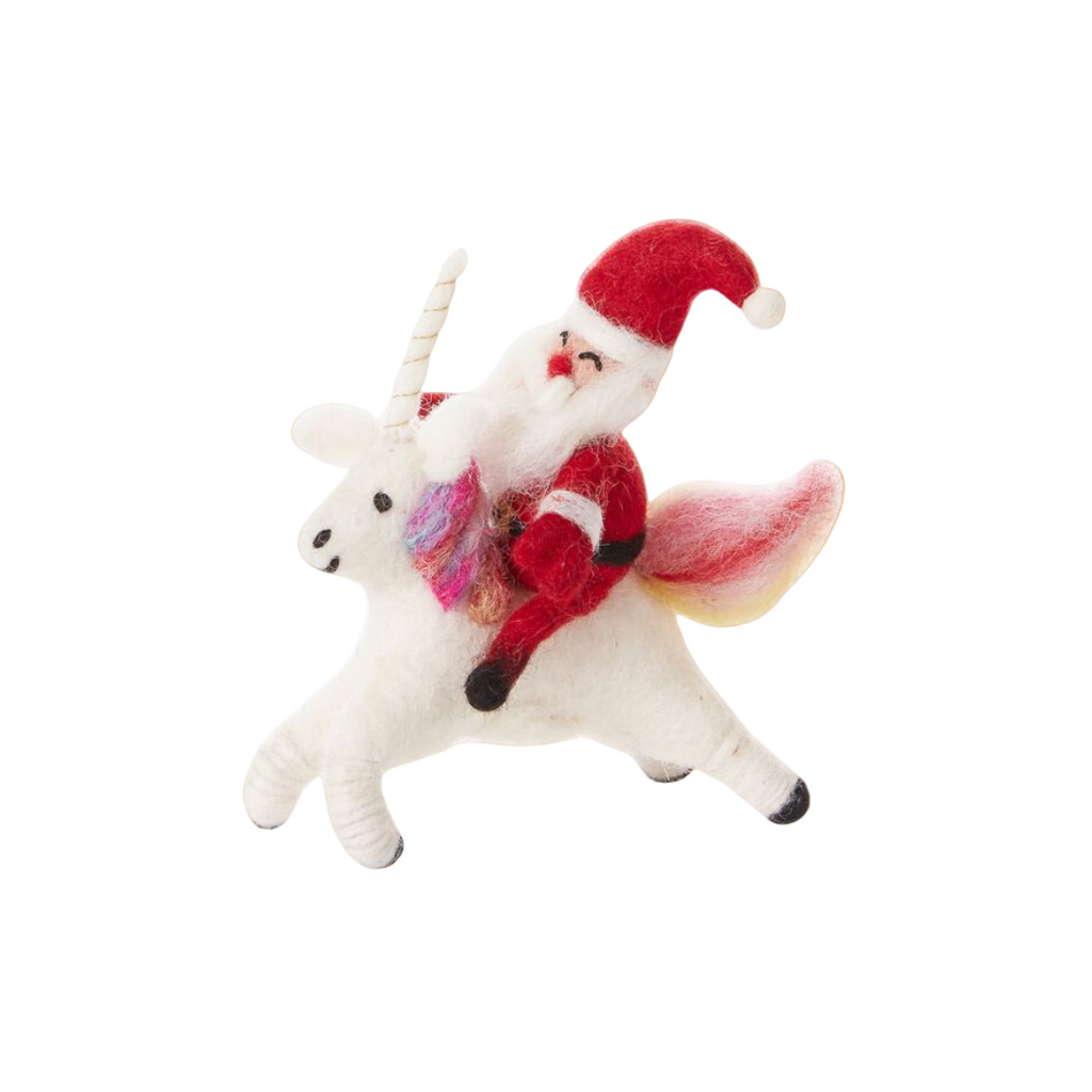 Imaginary worlds combine in the Fantastic Santa Ornament, a whimsical felt unicorn with Santa as a rider. The unicorn has a colorful mane and tail and a classically dressed Santa is along for the ride.
