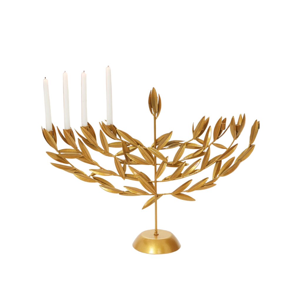 The Uriah Menorah is a brilliant gold menorah on a simple round base. Delicate metal leaves are layered on the branched arms and cradle standard-sized menorah candles. Candles not included.
