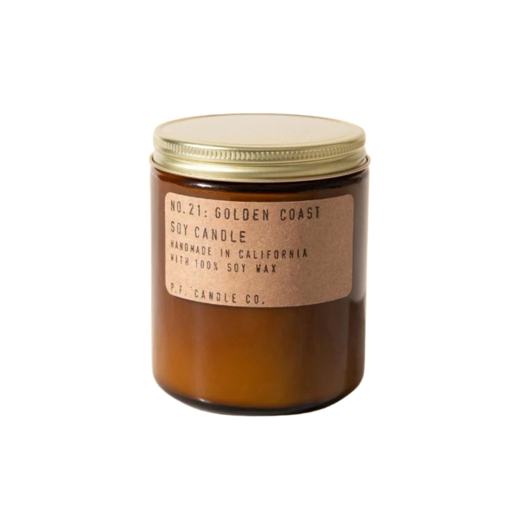 P.F. Candle Co.'s 7.2 oz Standard Candles are hand-poured into apothecary inspired amber jars with a signature kraft label and a brass lid. This is the most popular size and is meant for dressers, countertops, nightstands – basically everywhere.