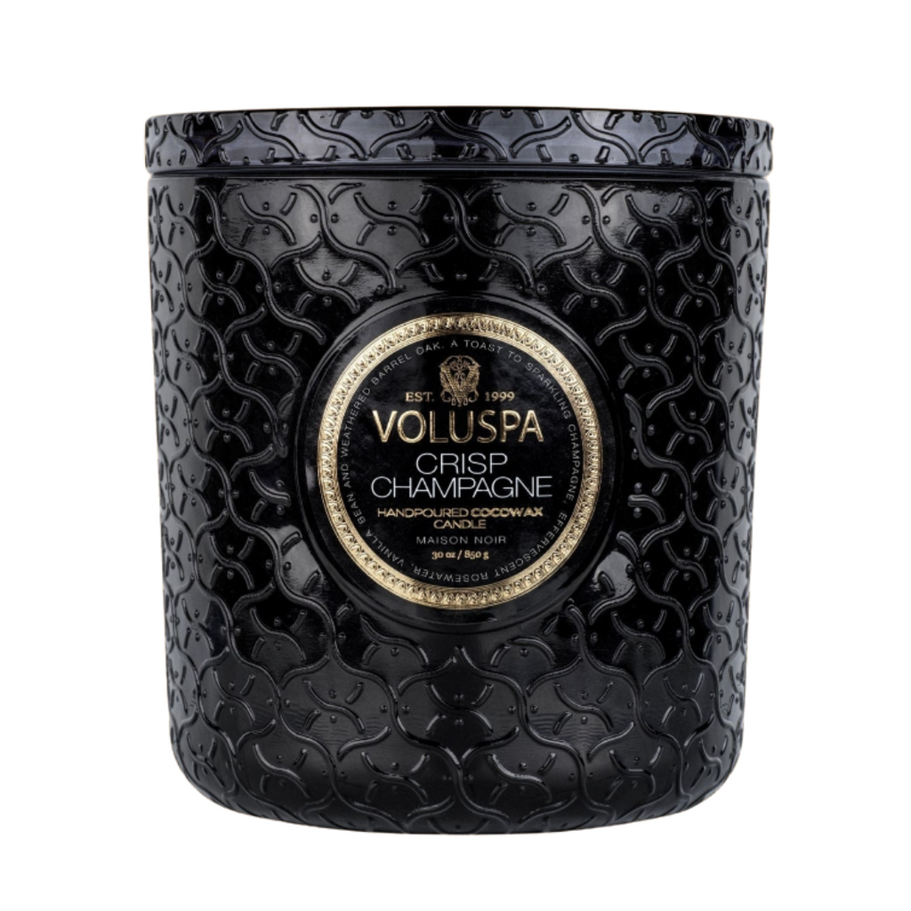 There is no shortage of luxury in our Maison Luxe Jar Candle. Voluspa's signature Maison pattern wraps the vessel in an elegant emboss from base to lid. The triple wick configuration transforms the ambience with its reflective glow, creating a generous wax pool to ensure abundant fragrance throw. As a finishing touch, the candle is perfectly designed to fit in the depression of the lid when lit.