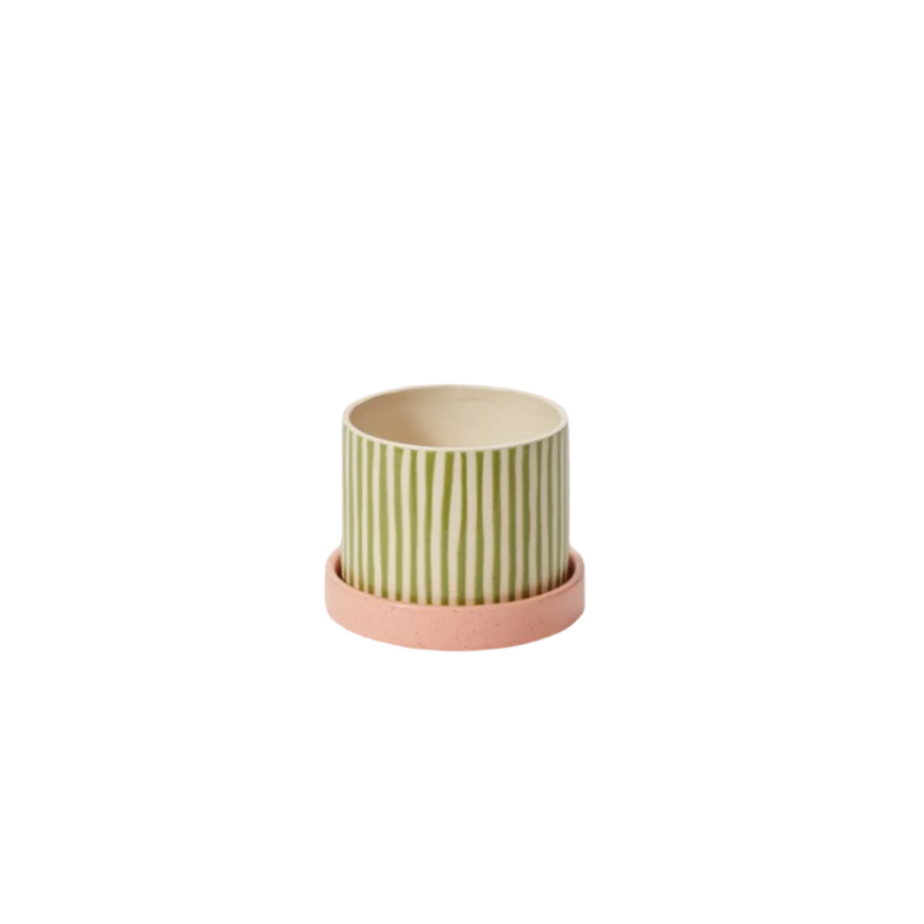 Reminiscent of a watermelon with its playful striped pattern & energizing hues, the small Melancia Pot lifts up the room with color. This pot with a drainage hole features hand painted glossy green vertical stripes on a natural clay base that contrasts nicely with the smooth matte coral pink saucer with a speckled finish. This fun indoor plant pot makes a happy addition to a modern plant shop & home decor.