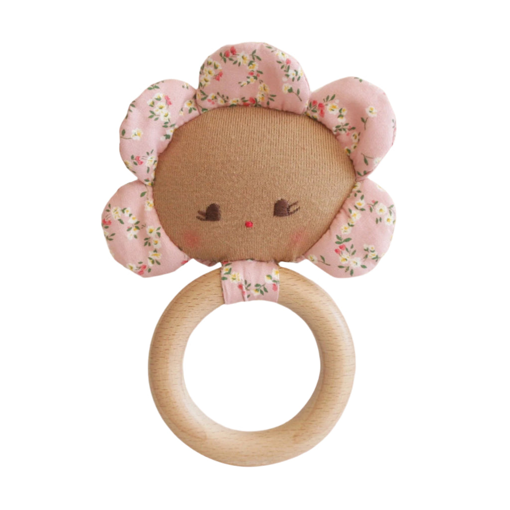 An adorable teether rattle toy featuring a sweet flower doll face on an all natural beechwood teether ring. Suitable from 3 months.