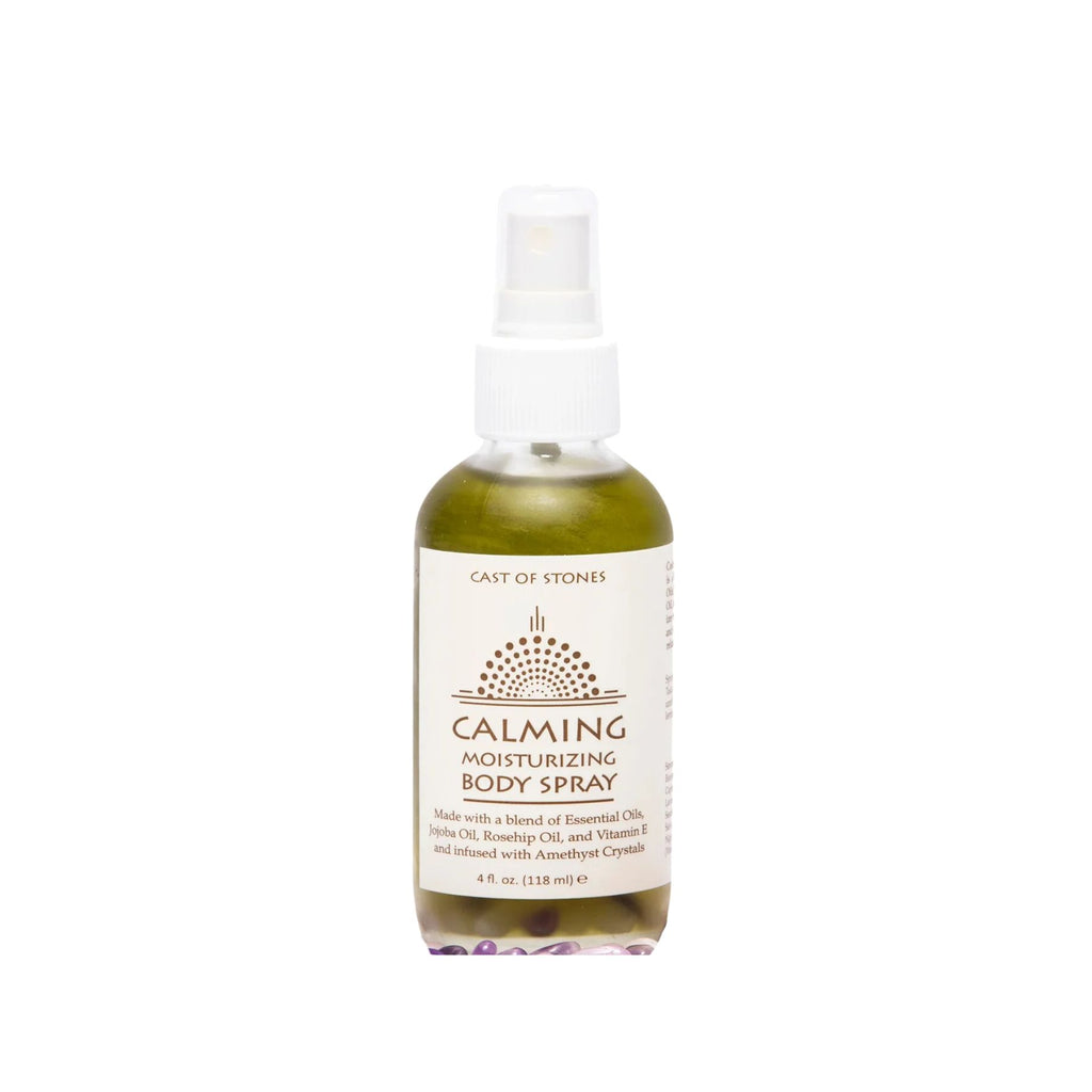 Cast of Stones Calming Body Spray is a thoughtful blend of Essential Oils, Jojoba Oil, Olive Oil, Rosehip Oil, and Vitamin E. A body moisturizer with the convenience of a spray, and made to help soothe the soul, relax the body, and pamper the skin.