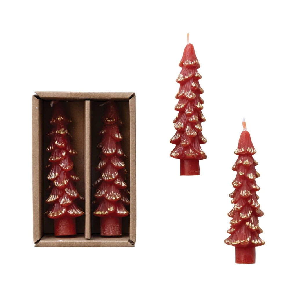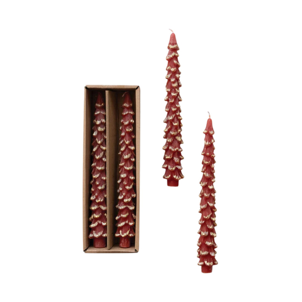 Unscented Tree Shaped Taper Candles w/ Gold Tips in Box, Holly Berry, Set of 2.