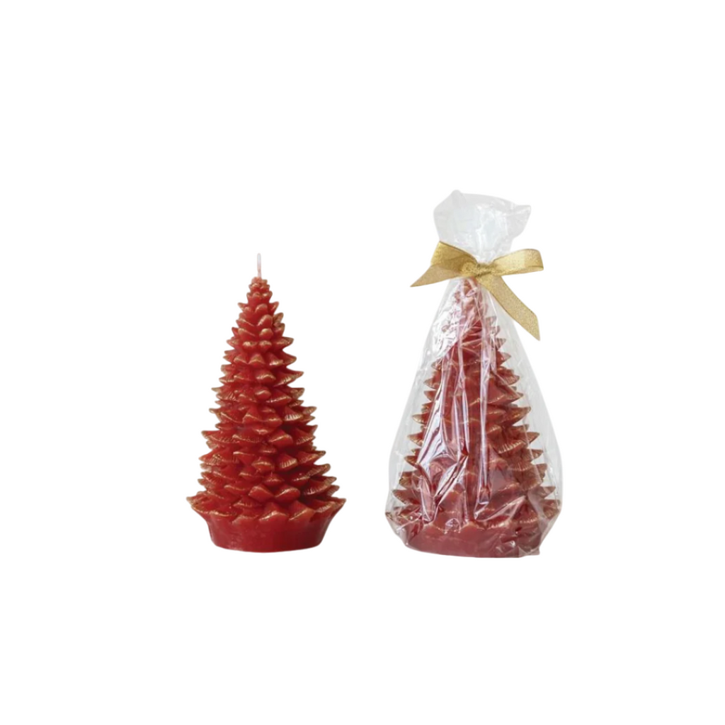 Add a sophisticated touch to the holiday decor with the holiday tree-shaped candle. This unscented candle, shaped like a festive tree and finished with gold tips, comes in holly berry color to complement any room or occasion.