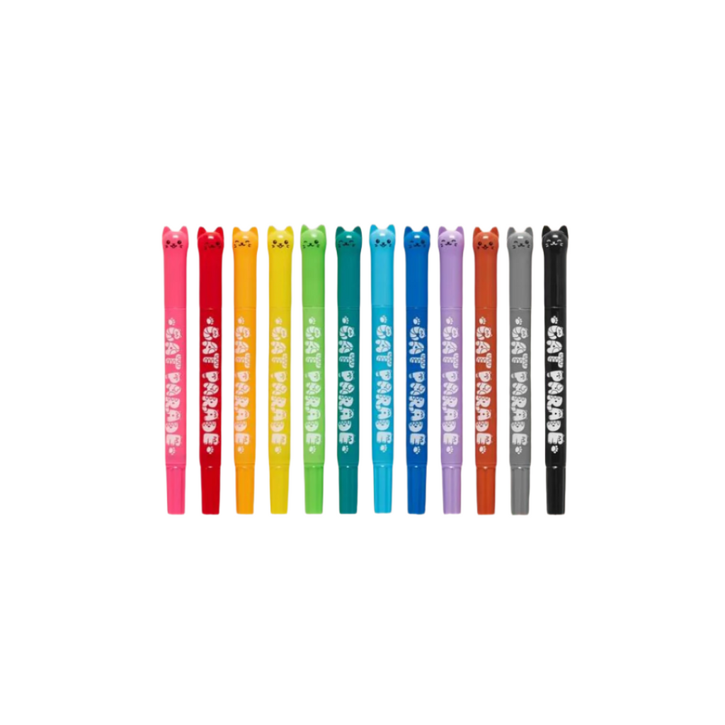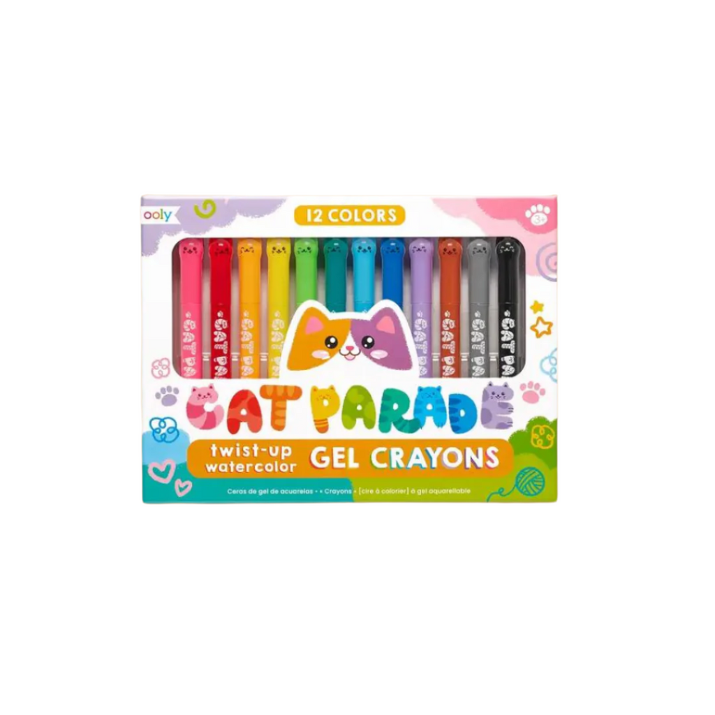 Easy to hold plastic twist-up barrels make the Cat Parade Gel crayons the cats meow. Smooth bright coloring is a breeze with these 12 water soluble gel crayons plus add water with a paint brush to make watercolor effects. Fun and clean to use with a variety of kitten-faced caps, plastic twist-up barrels and 12 brilliant colored gel crayons Cat Parade crayon set will delight the user. Pair with the LIttle Cozy Critters Color-in’ Book for tons of animal coloring fun.