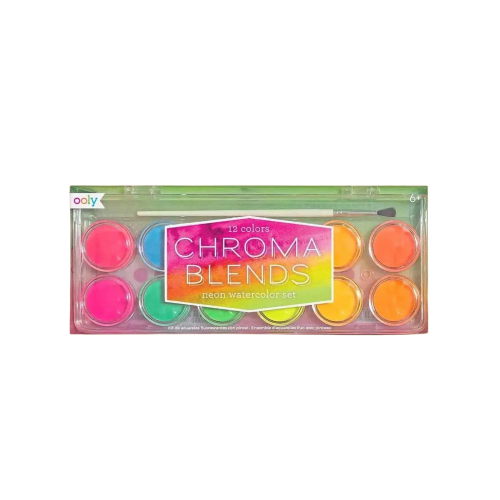 This 12 blendable neon watercolor paint set includes a brush let you create an infinite amount of new colors on the spot, each with a bright neon sheen. Chroma Blends™ 13 piece watercolor set 12 blendable neon colors Paintbrush included Bright enough to work on black paper Cover doubles as a paint palette Suitable for ages 6 and up