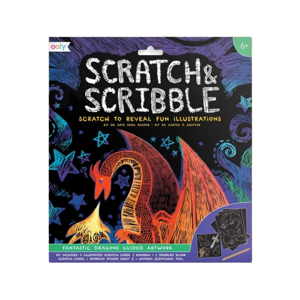Fantastic Dragons Scratch and Scribble scratch art kits let you scratch away the black to reveal a rainbow of vibrant colors with every stroke. Fantastic Dragon scratch card kit Kit includes: 4 illustrated scratch cards (5.8 x 8.3 inches), 2 rainbow and 2 sparkled blank scratch cards (5.8 x 8.3 inches), 1 sparkled sticker sheet (7.8 x 7.8 inches), and 1 wooden scratching tool Guided illustrations are easy for kids to follow Add your own patterns and designs to create a unique work of art Everything that you need is included, along with instructions to get you started. See how it works: wholesale.ooly.com/scratch-scribble.