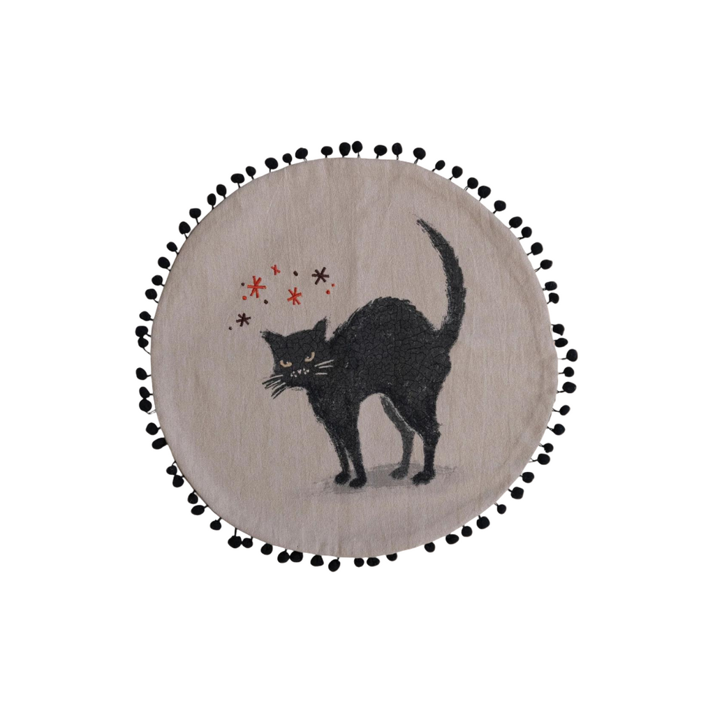 16" Round Cotton Chambray Printed Pillow w/ Black Cat, Embroidery & Pom Pom Trim, Natural, Black & Orange Color