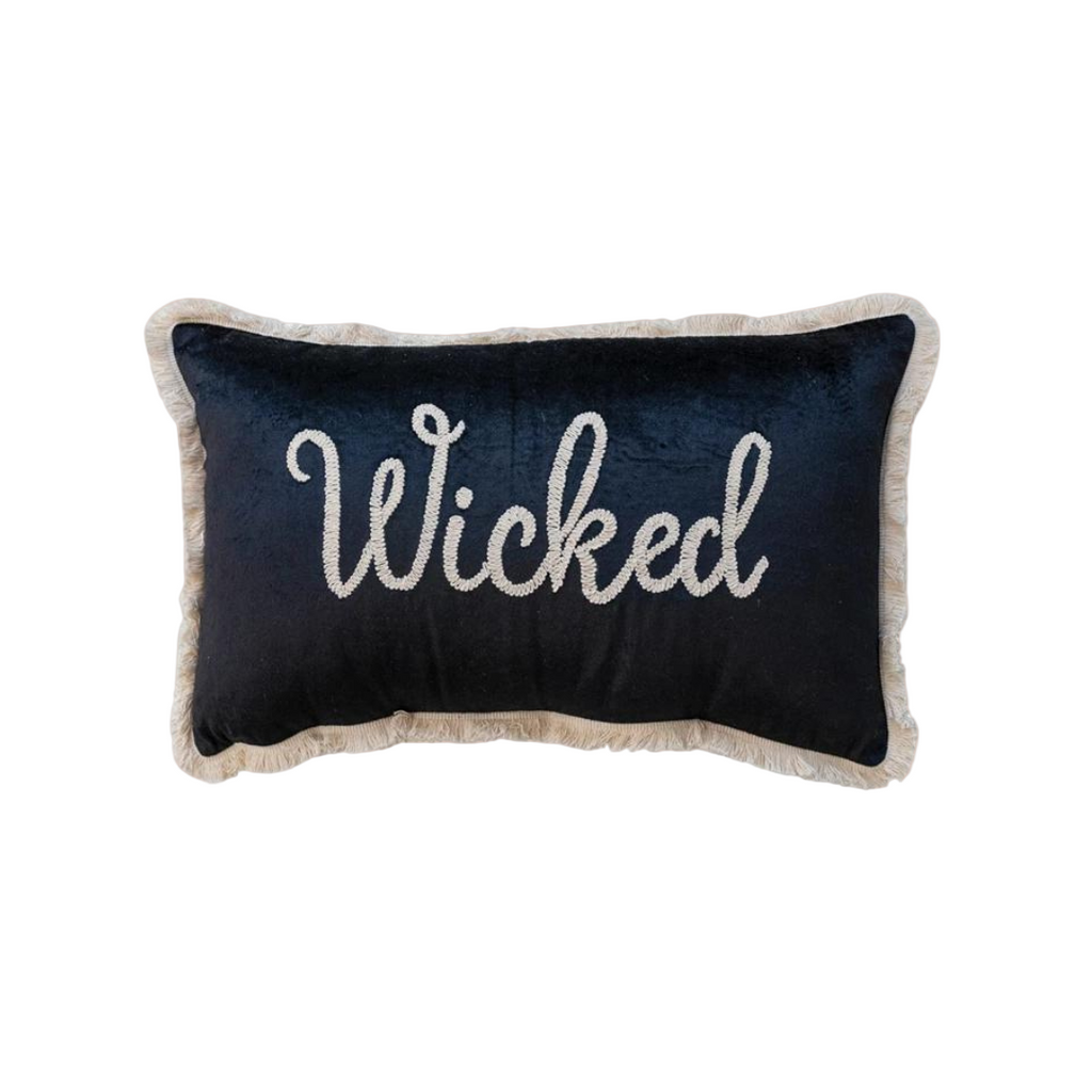 Elevate your Halloween decor selections with the Cotton Velvet Lumbar Pillow featuring exquisite embroidery and fringe details. The "Wicked" design in striking black and cream colors adds a touch of sophistication and drama to any living space.