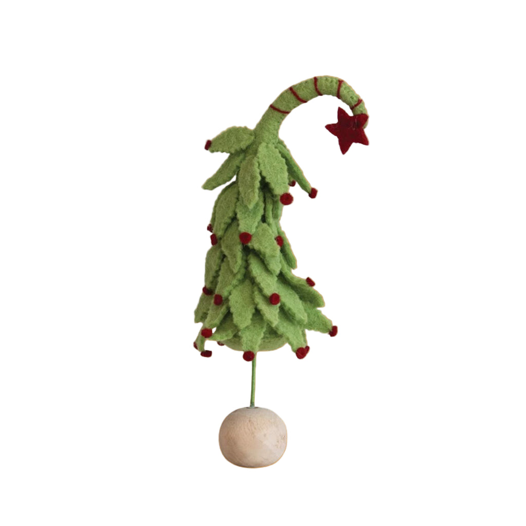 Handmade Wool Felt Tree w/ Star, Berries & Wood Ball Base, Green & Red.