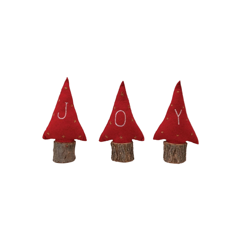 These festive trees are a beautiful way to decorate for the holiday season. Made out of red wool felt, they feature wooden bases and embroidered gold twinkle lights and a white letter on each tree to spell the word "Joy".