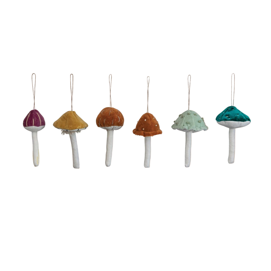 Cotton Velvet Mushroom Ornament w/ Embroidery & French Knots, Multi Color, 6 Styles.