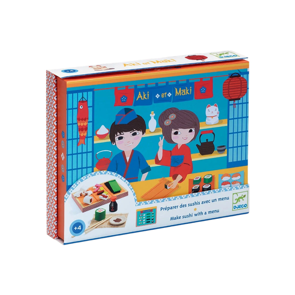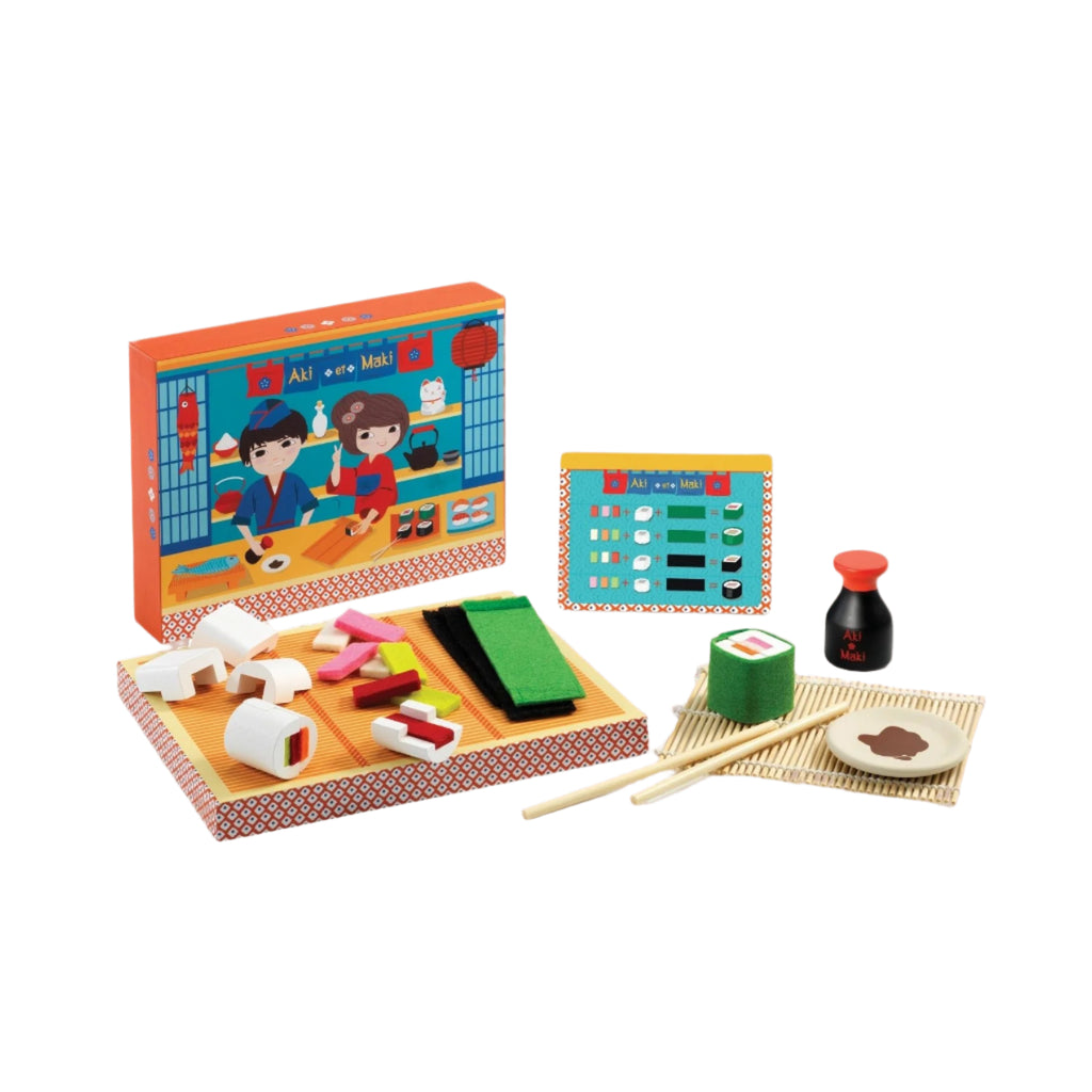 With this sushi chef role play set, the invitation for make believe lets little ones dream of the “me” they want to be! A beautiful solid wood box becomes part of the play scene and stores the contents. A reversible menu card encourages restaurant role play. Includes 1 recipe card, 1 mat, 1 small plate, 1 bottle, 2 chopsticks, felt and wood pieces to build 4 sushi rolls.