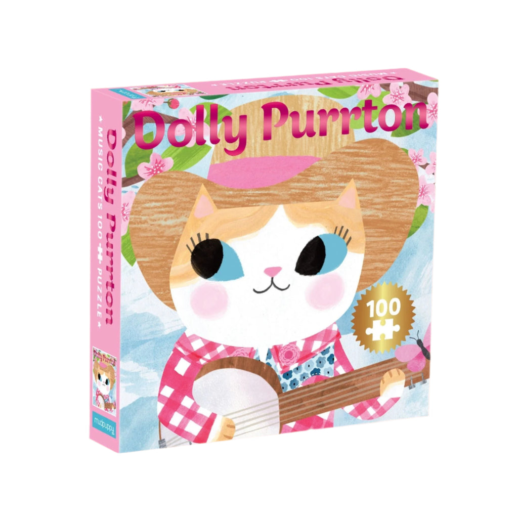 Introduce a music legend with this puzzle inspired by the iconic country star. The Dolly Purrton Music Cats 100 Piece Puzzle includes shiny foil embellishments on the box and puzzle and is great fun for everyone. Mudpuppy puzzles are packaged in matte-finish sturdy boxes, perfect for gifting, reuse, and storage. Puzzle greyboard contains 90% recycled paper. Packaging contains 70% recycled paper. Printed with nontoxic inks.