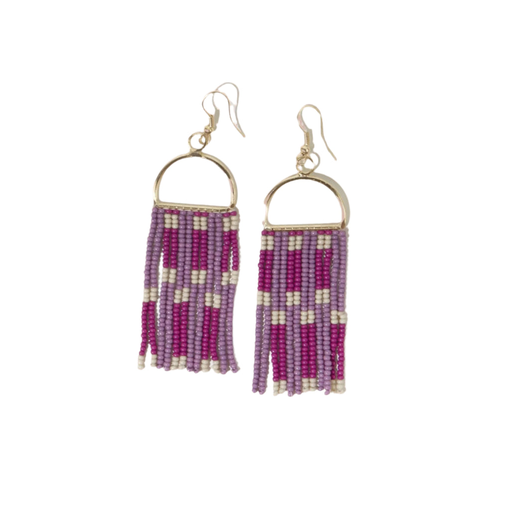 You are sure to be retro-cool in these checkered fringe earrings! Purple and Cream seed bead earrings will surely bring a fun pop of color to your next work fit! Channel your inner spunk with these lightweight earrings.