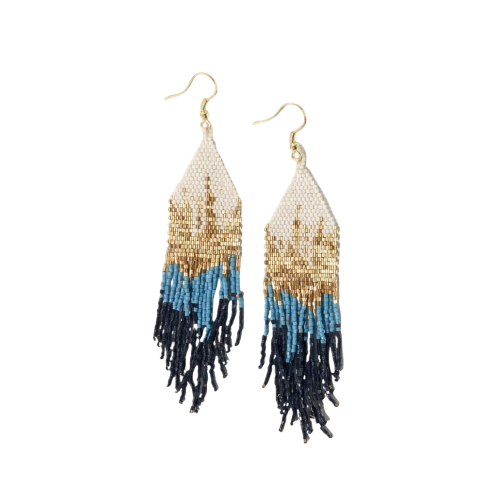 A must for those who love their everyday delicates with a touch of evening elegance. These blue, navy, gold, and cream ombre earrings are handwoven with an effortless shimmer to easily elevate any look!