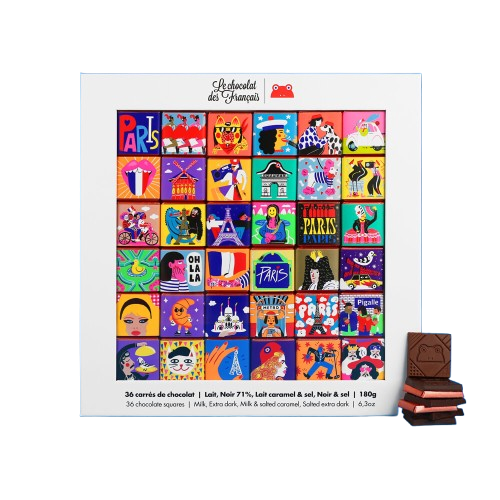 Let yourself bring into Paris magic with this 36 squares box of chocolate and its 4 recipes : milk, extra dark 71%, milk and caramel, and dark & salt. Perfect to go along with your coffee break!