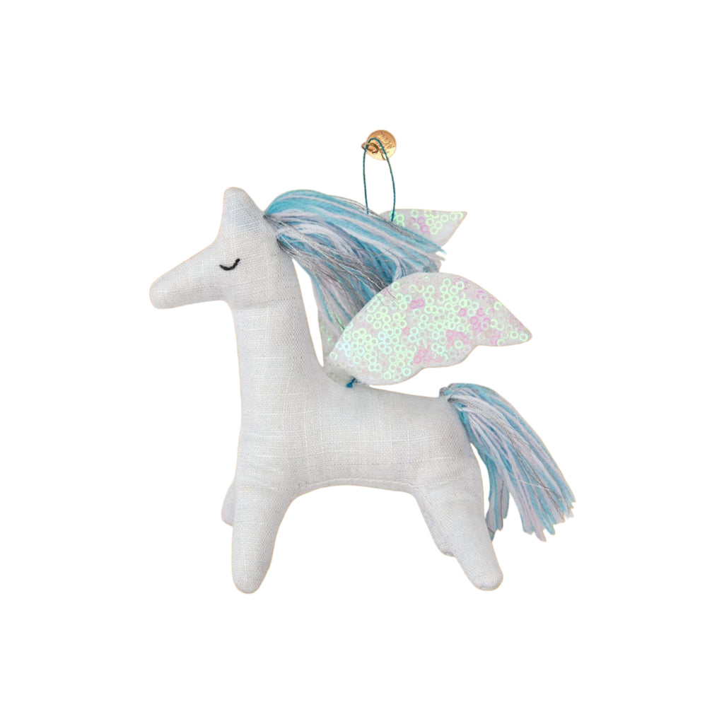 Give your Christmas tree a magical touch with this fantastic decoration. Featuring a beautifully designed and crafted felt unicorn, with sweet stitched features, glittery wings and a shimmering yarn mane and tail.