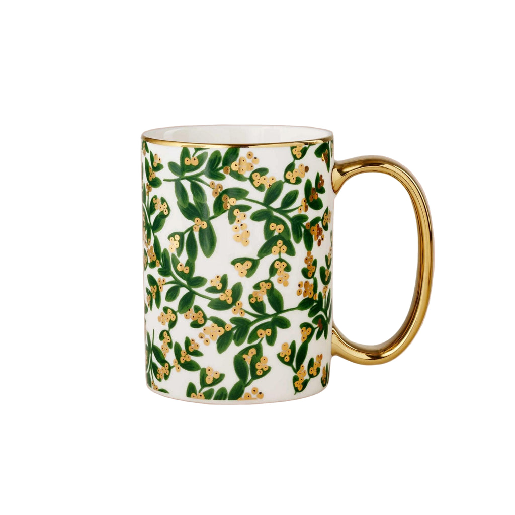 A Mistletoe mug to get you into the holiday spirit. Our porcelain mugs feature illustrated designs with gold accents and a gilded rim and handle to add a festive touch to your favorite beverage.