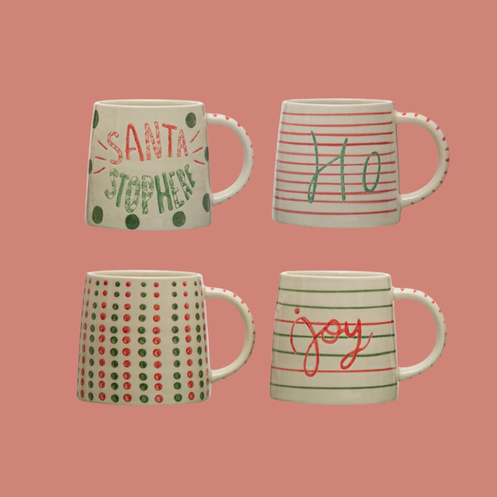 Hand-Painted Stoneware Mug w/ Holiday Word/Pattern, Red & Green, 4 Styles.