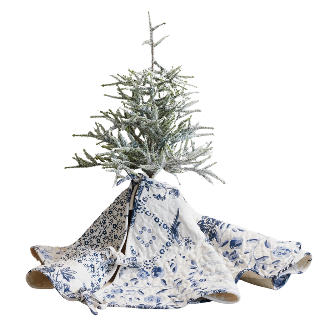 Add a touch of handcrafted charm to the Christmas tree with our patchwork tree skirt. The skirt's quilted cotton fabric is adorned with a patchwork of floral patterns, rendered in a soothing palette of white and blue.