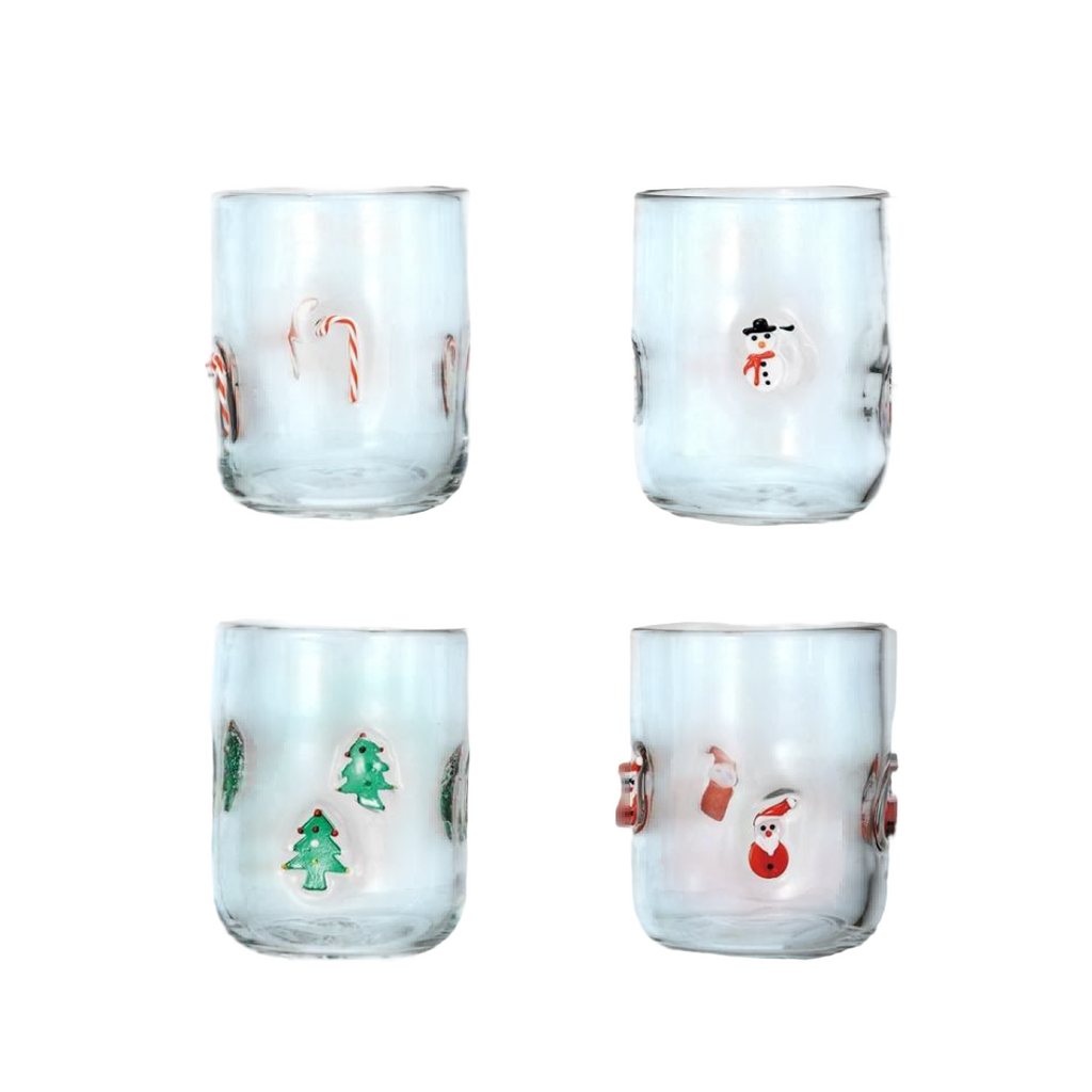 3-1/2" Round 16 oz. Drinking Glass w/ Embedded Holiday Icon Pattern, Multi Color, 4 Styles