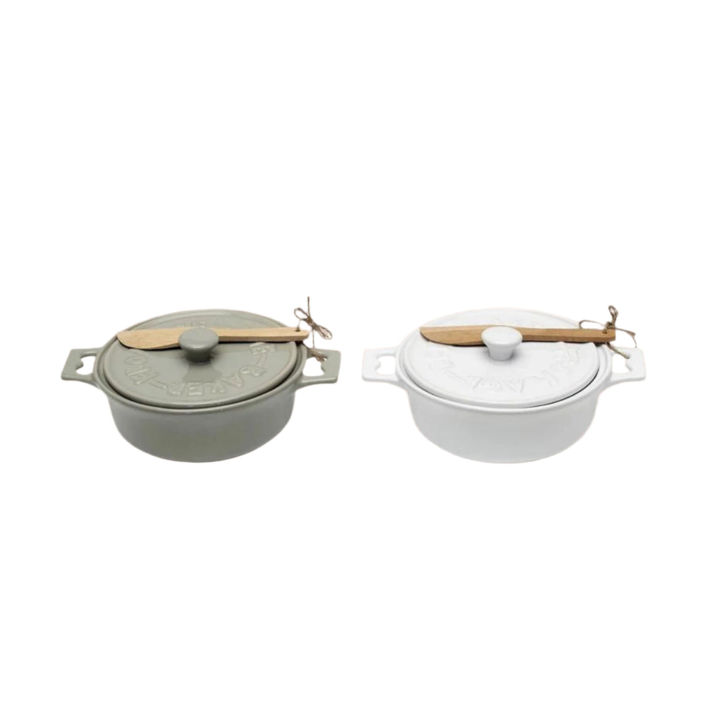 Is there anything better than baked brie? Baked brie with added ingredients like apricots, honey and walnuts !! The only improvement we have found is to use these gorgeous brie bakers, in white or grey- presentation is so important to the enjoyment of good food! Each Brie baker comes with a wooden spatula perfect for that warm just out of the oven Brie!