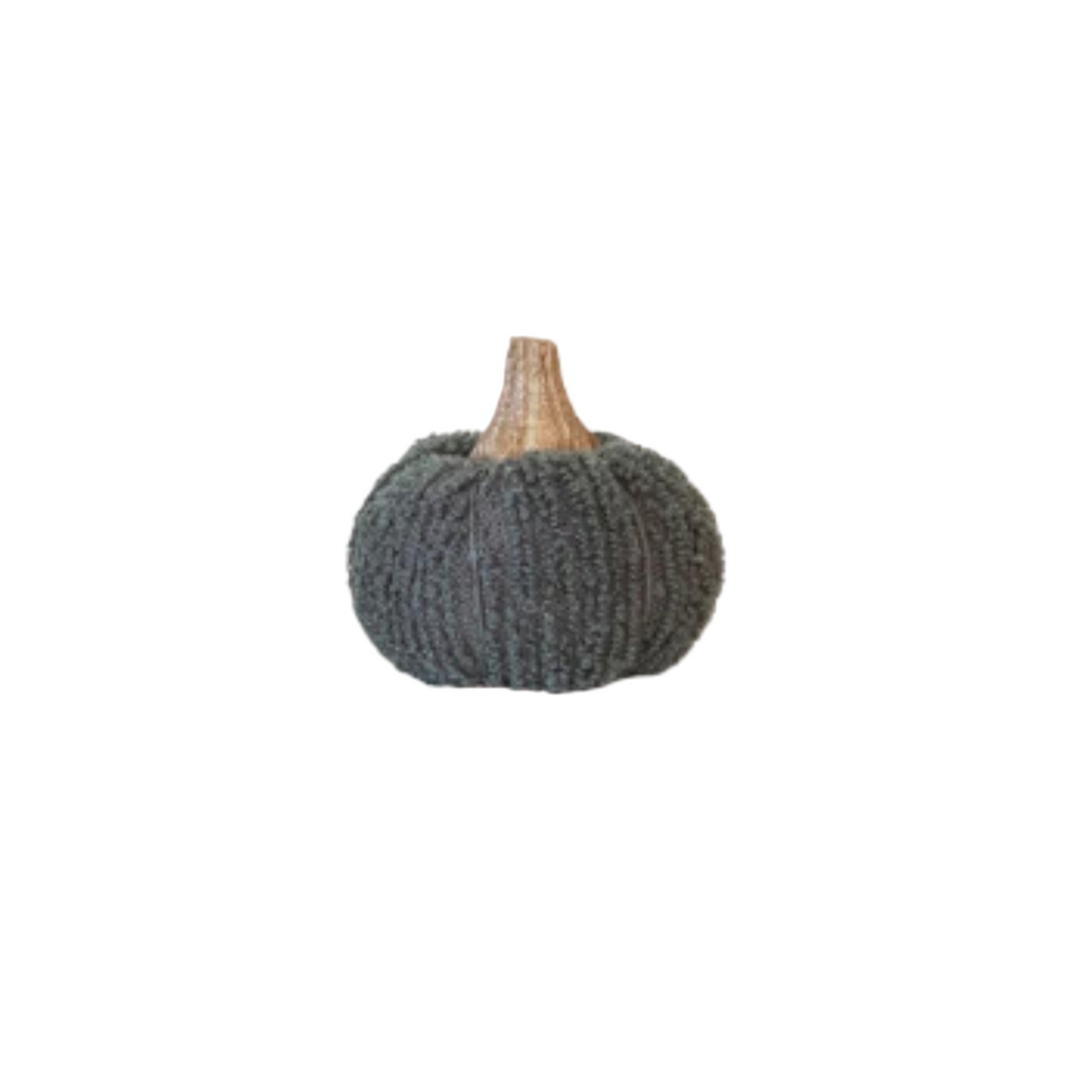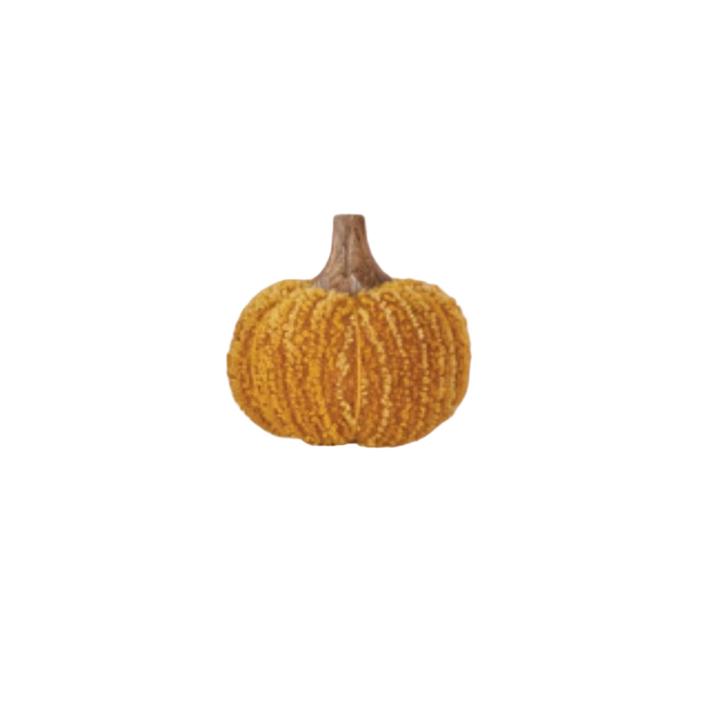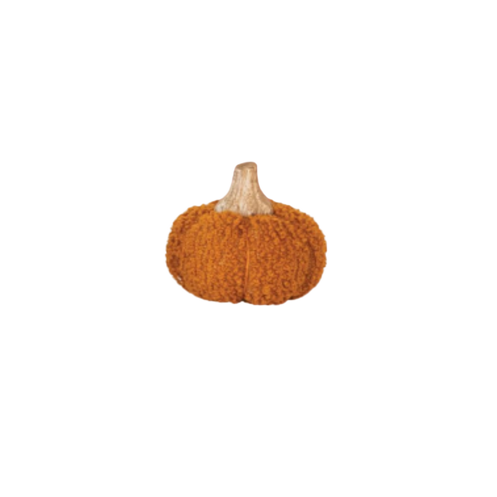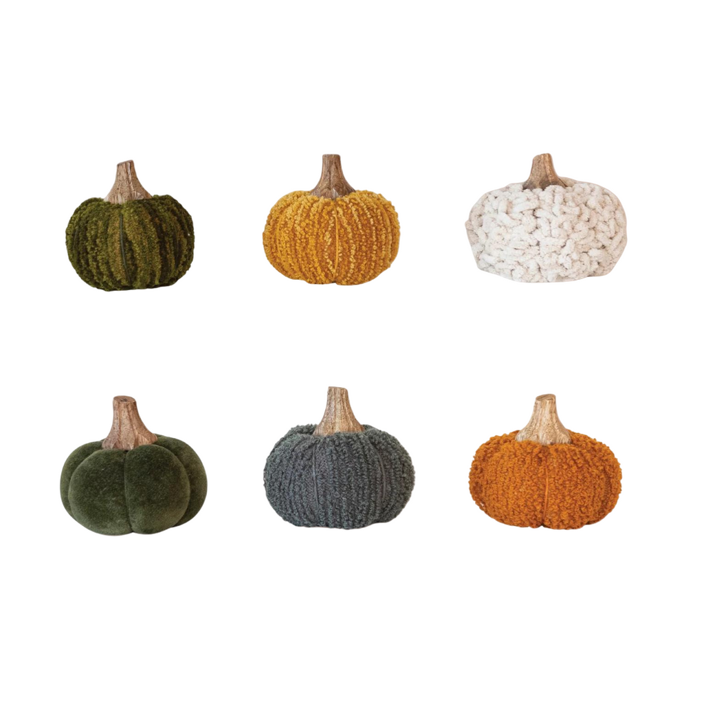 Catalog Name: 3-1/2" Round x 3"H Cotton Blend Bouclé/Velvet Pumpkin w/ Wood Stem, 6 Styles