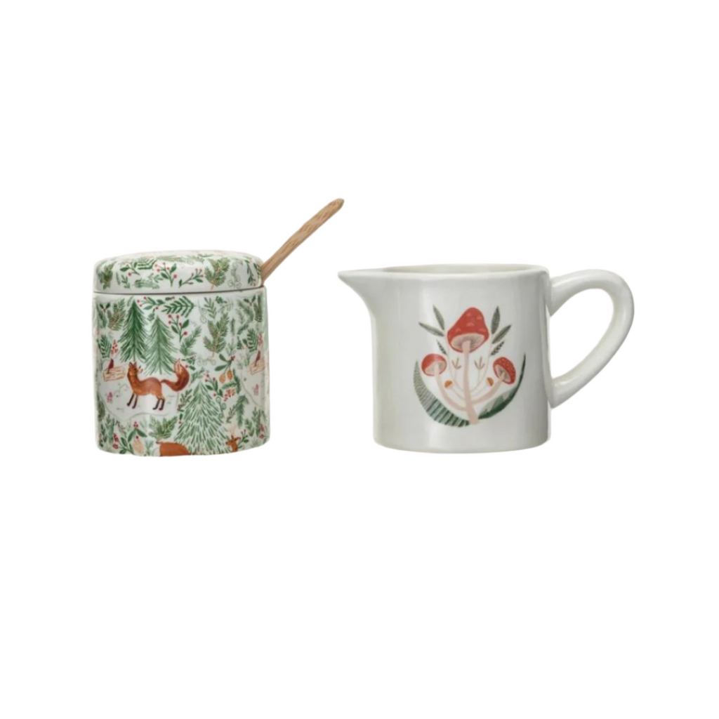4-3/4"L x 2-3/4"W x 3"H 5 oz. Creamer & 2-3/4" Round x 3"H Sugar Pot w/ Wood Spoon & Woodland Flora/Fauna, Multi Color, Set of 3
