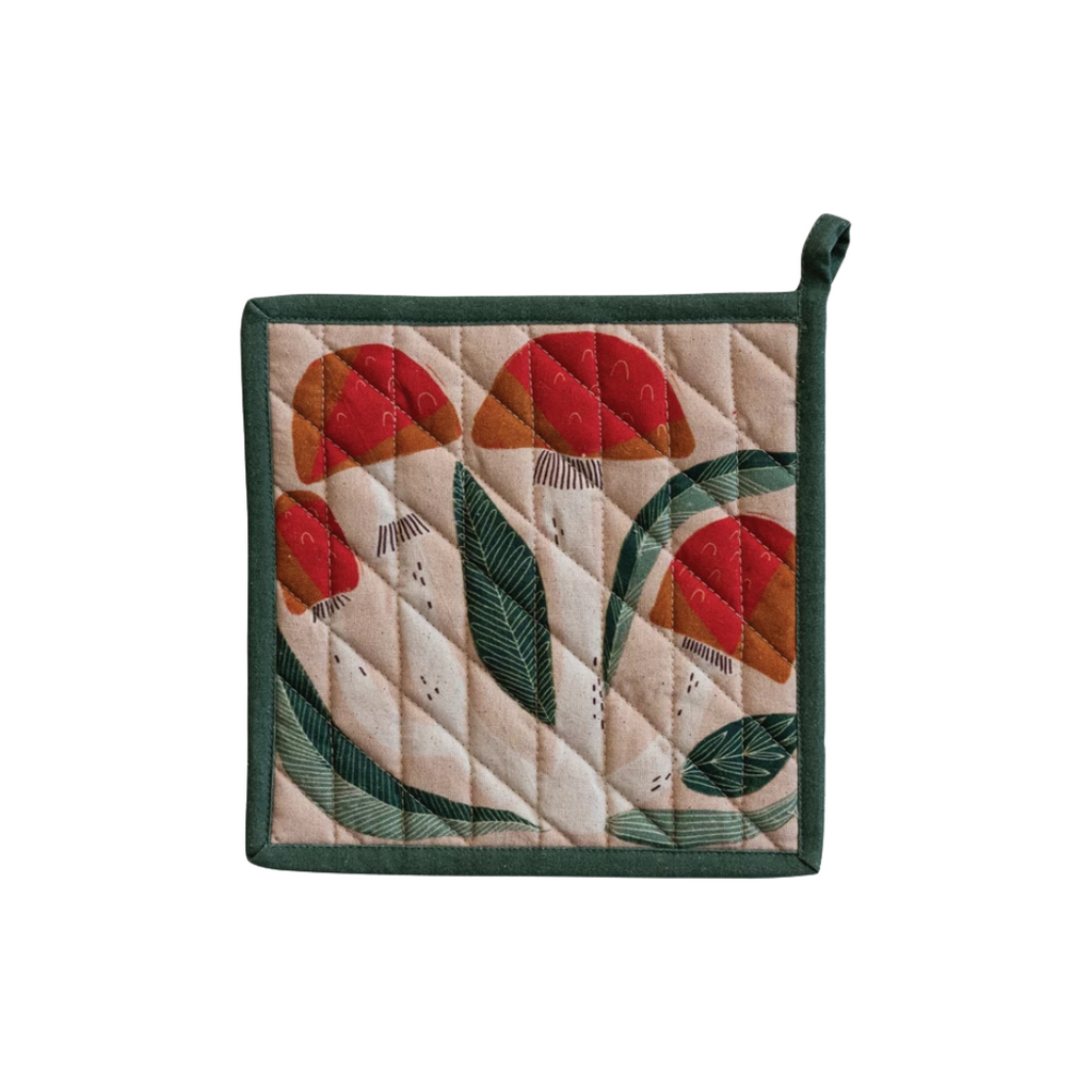 8" Square Quilted Cotton Pot Holder with Mushrooms, Multi Color