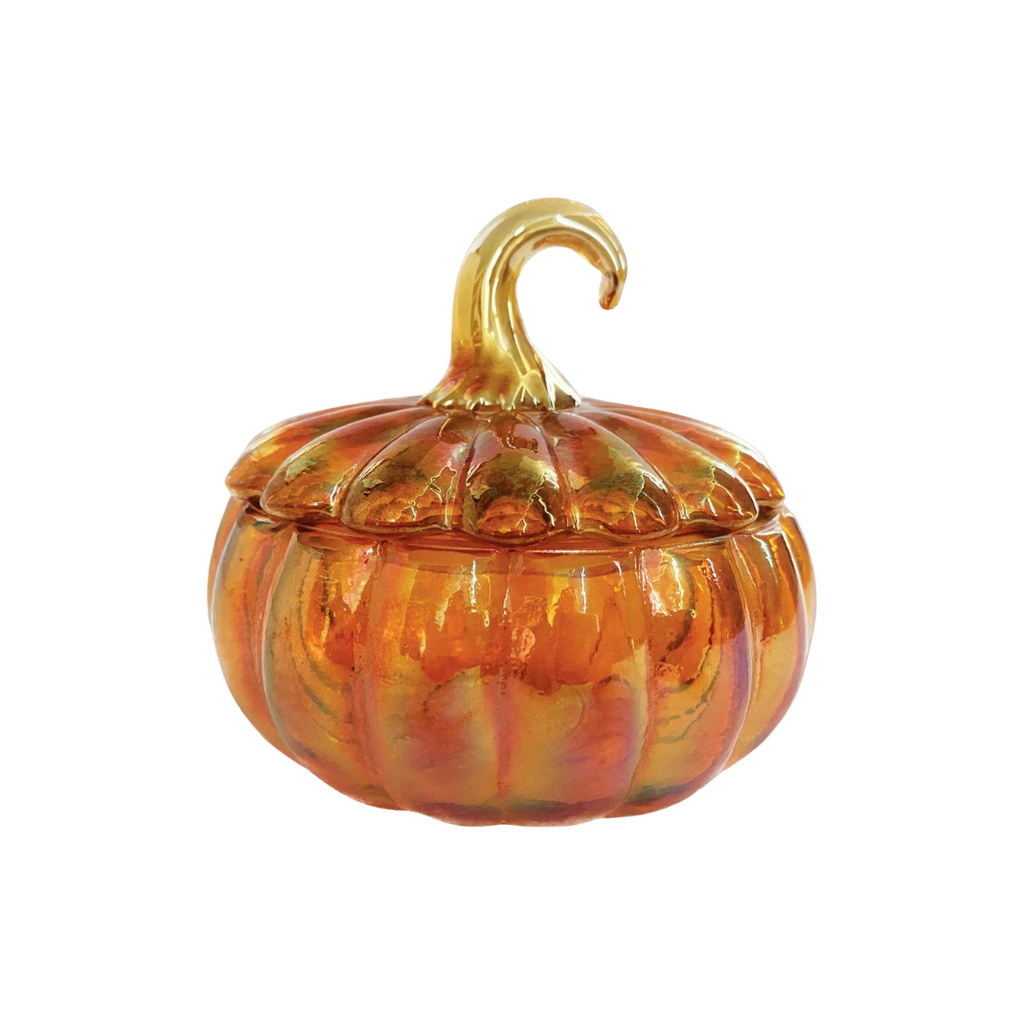 Catalog Name: 4-1/2" Round x 4-1/2"H Recycled Glass Pumpkin Shaped Jar w/ Lid, Iridescent Orange Color