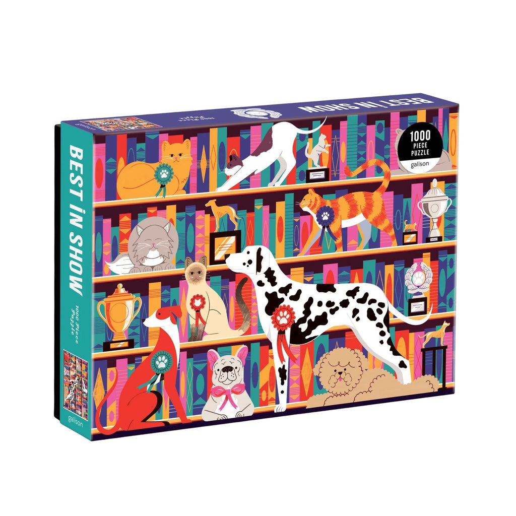 Best in Show 1000 Piece Puzzle is a witty shelfie of prize-winning cats and dogs sharing a colorful display of trophies and books.