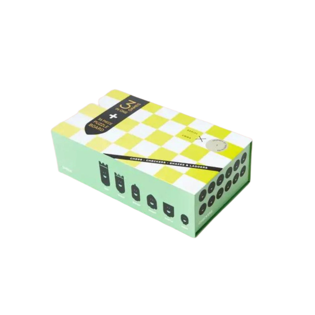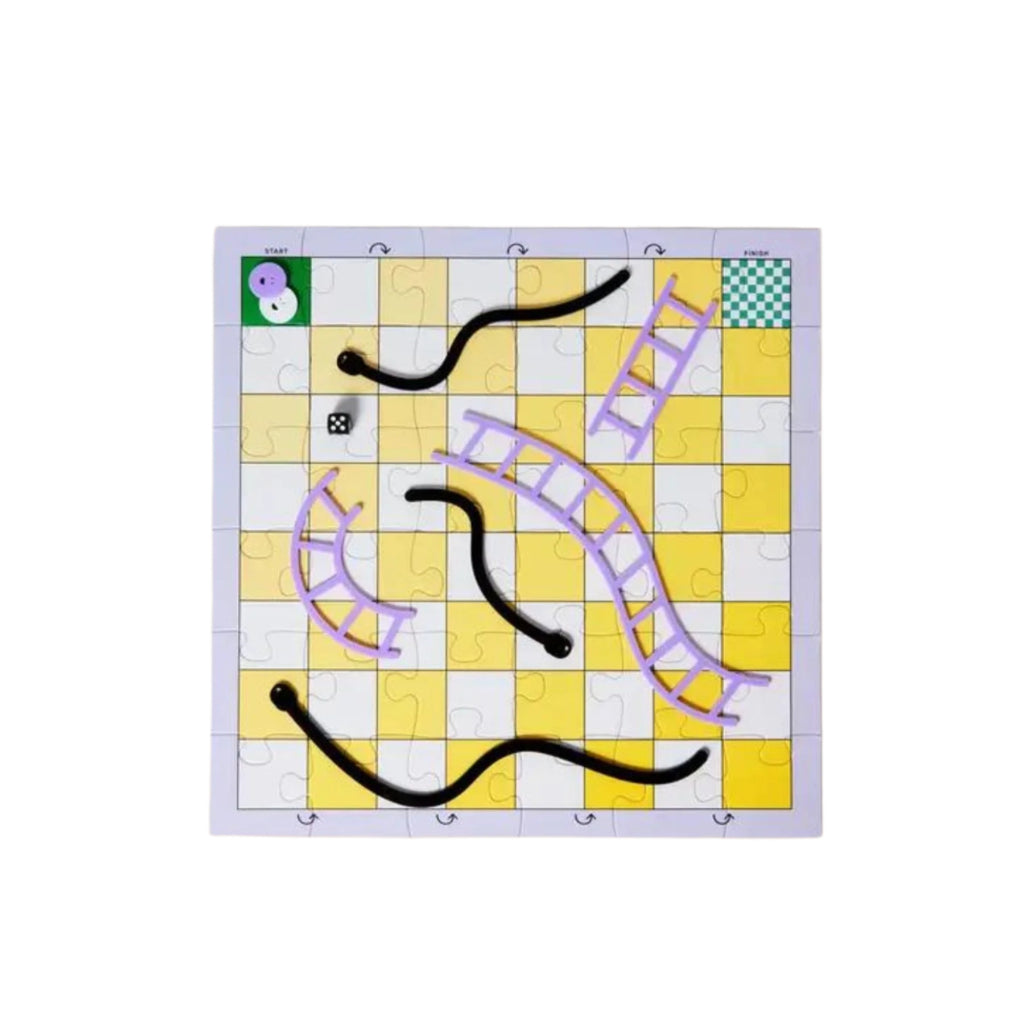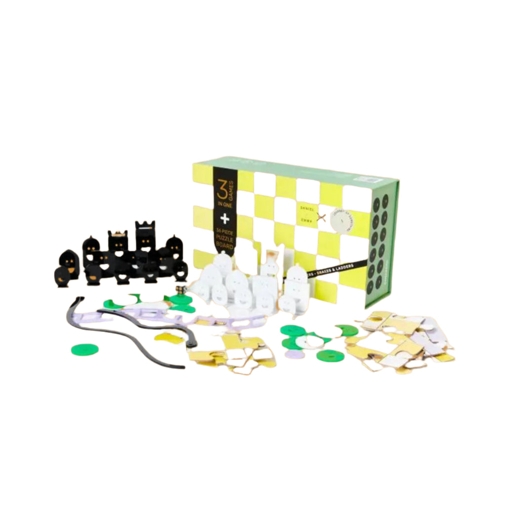 Designed in collaboration with Daniel Emma, this awesome box contains three classic games: Chess, Checkers & Snakes & Ladders. Plus there's a bonus game - you need to build your game board out of puzzle pieces first.