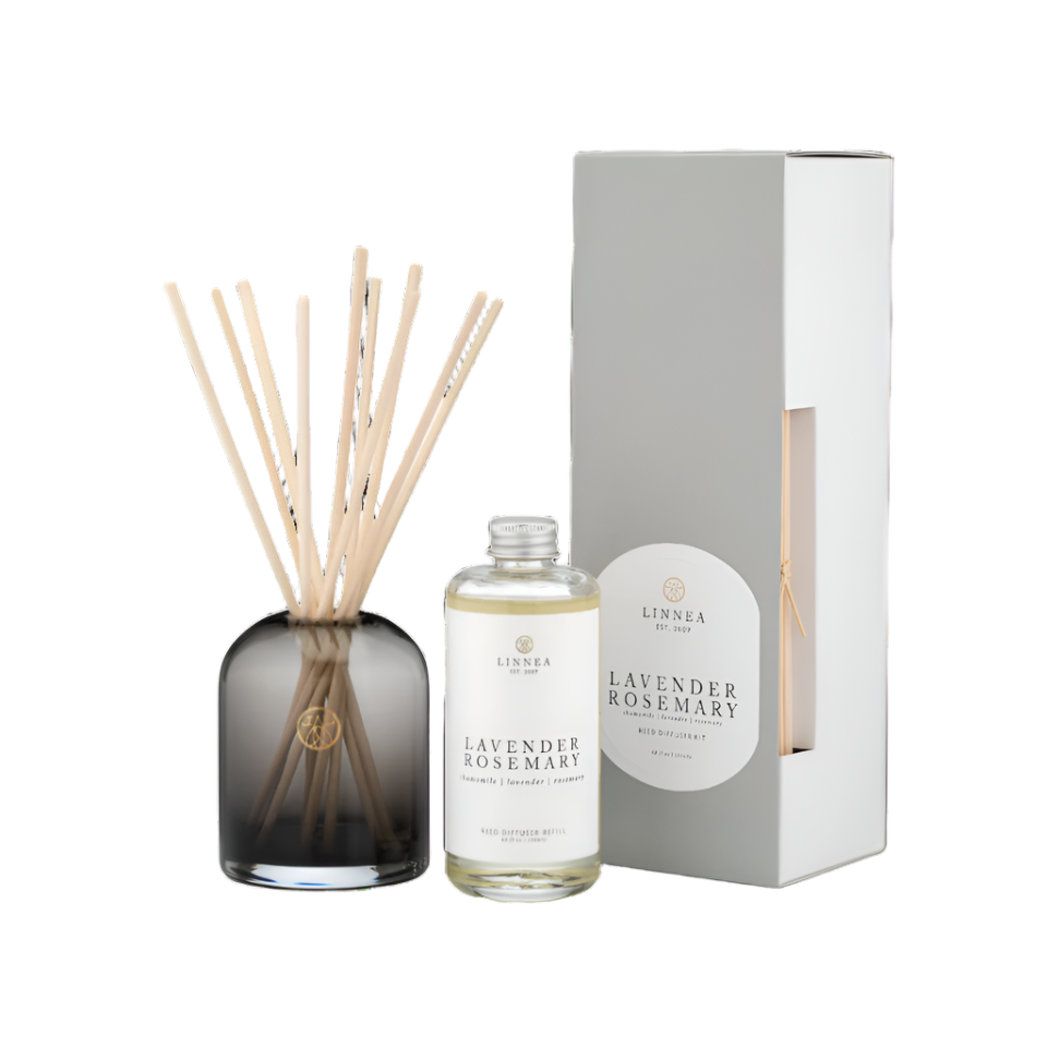 Immerse your space in a soothing blend of botanical serenity. This elegantly crafted set features a smoke gray glass vessel and natural rattan reeds, designed for effortless fragrance diffusion. Herbaceous rosemary, calming lavender, and delicate chamomile blend harmoniously, creating a tranquil retreat. A timeless gift for relaxation and renewal, perfect for any space.