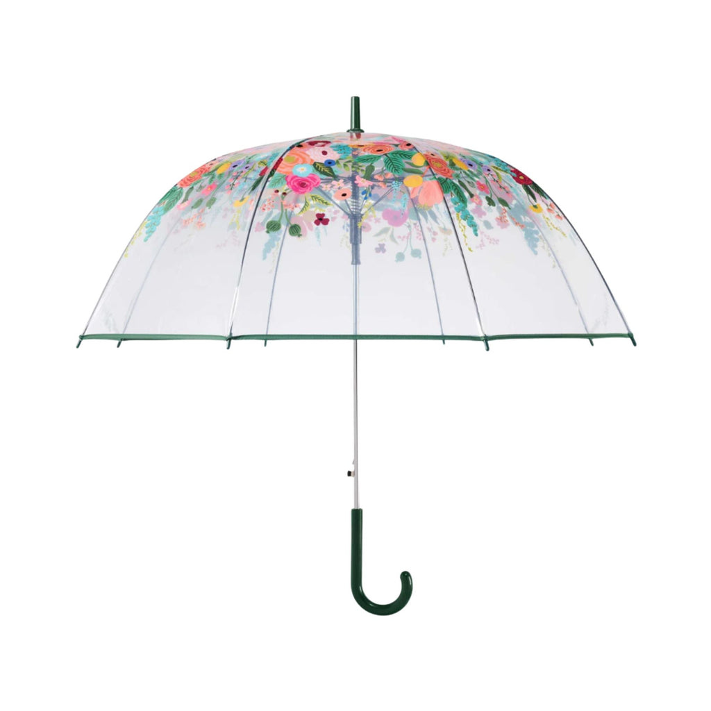 Rifle Paper Co.'s clear Garden Party Umbrella will brighten any rainy day. The umbrella features a transparent canopy, a green hooked handle, and an auto open/close function.