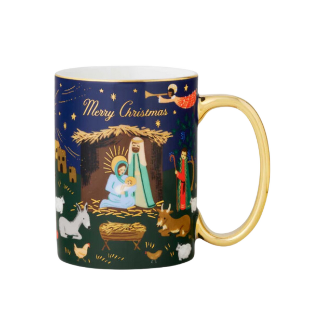 This mug features an illustrated Nativity scene, painted by our co-founder Anna Bond. Its gilded rim and handle add a little something special to your favorite beverage.