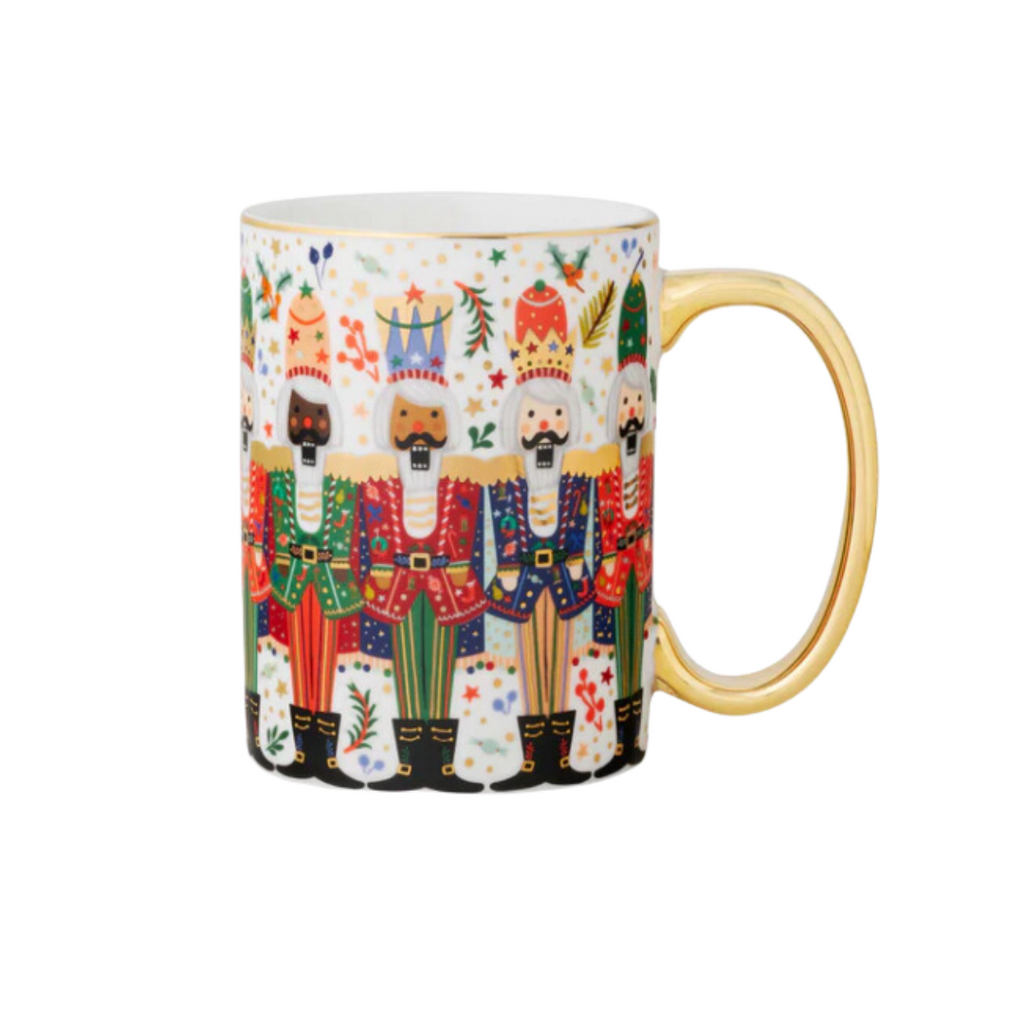 A brigade of marching Nutcrackers are standing ready on this festive mug, with a gilded rim and handle to add a little something special to your favorite beverage.