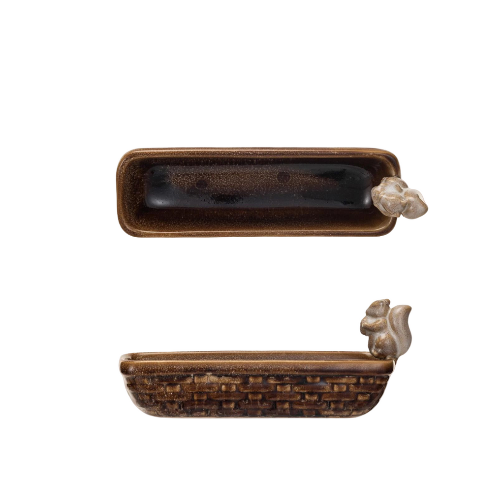 Creative Co-op - Stoneware Dish with Debossed Pattern & Squirrel Holding Acorn