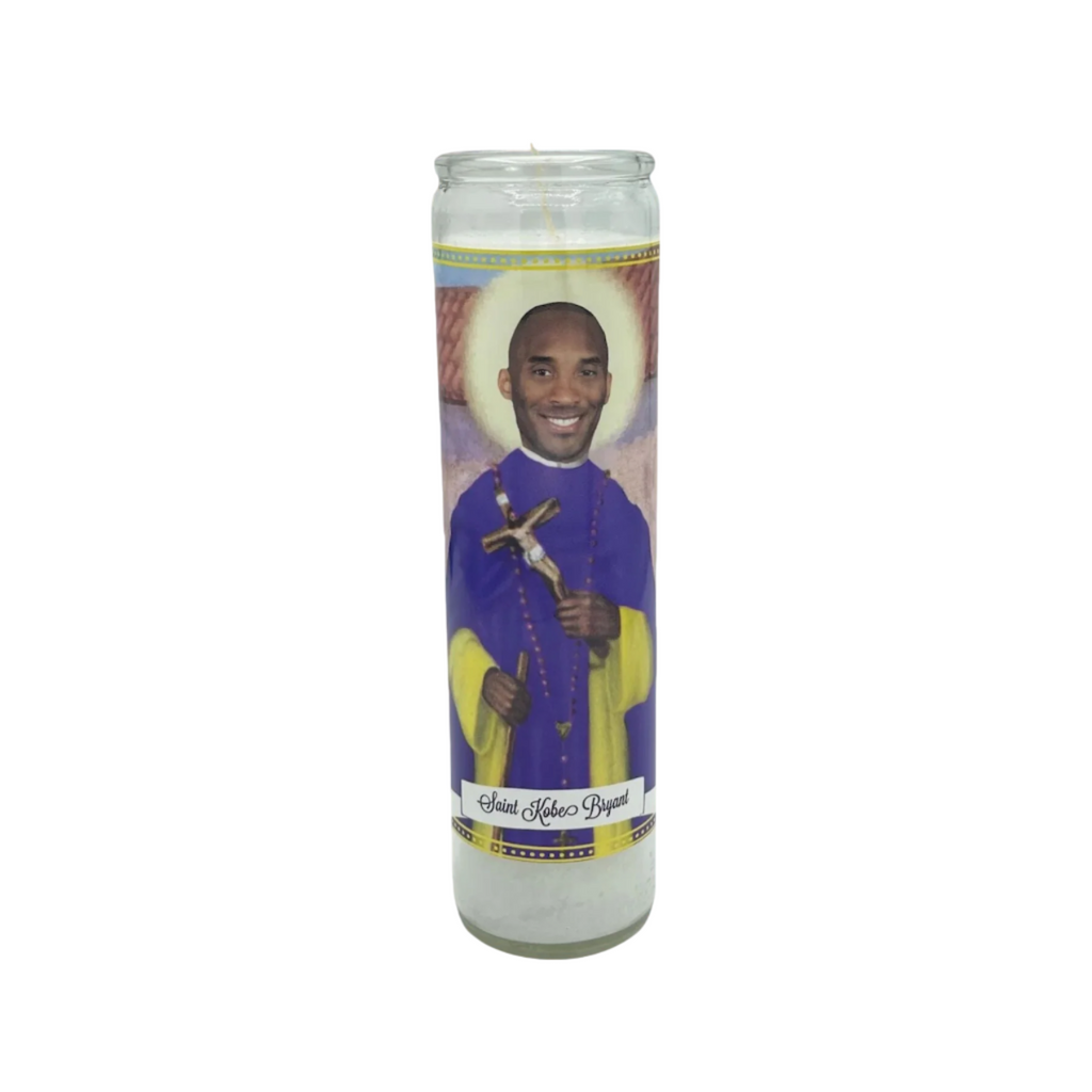 Tall white altar/prayer candle featuring the patron Saint of the LA Lakers