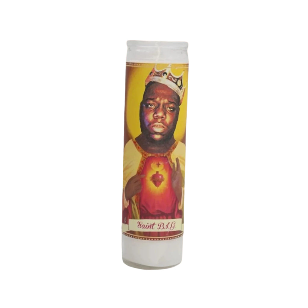Tall white altar/prayer candle featuring the Patron Saint of Juicy.