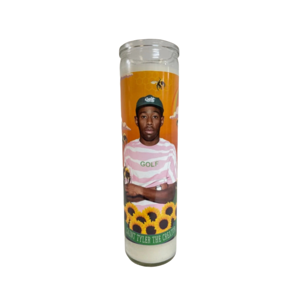 Tall white altar/prayer candle featuring the Patron Saint of EARFQUAKE.