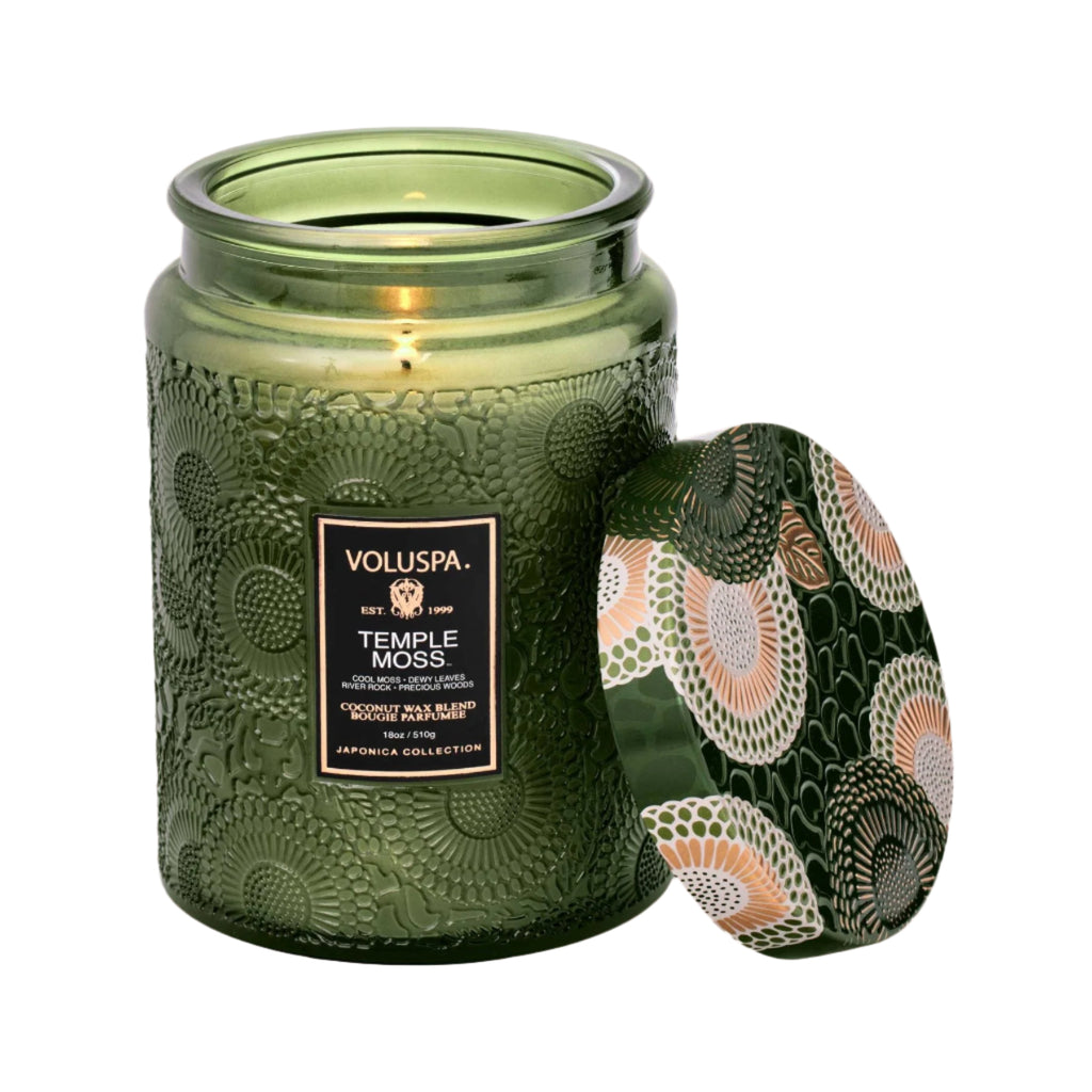 Voluspa invites you to seek solace in the forest floor. Ground down in the healing notes of cool moss, dewy leaves, wet stones, and warm sun peeking through the thicket of Hinoki branches. The Master Perfumer herself, Mother Nature, will guide you to tranquility through rhythmic sights, sounds and scents of her lush forest. All are welcome to wander the aromatic grounds of Temple Moss.
