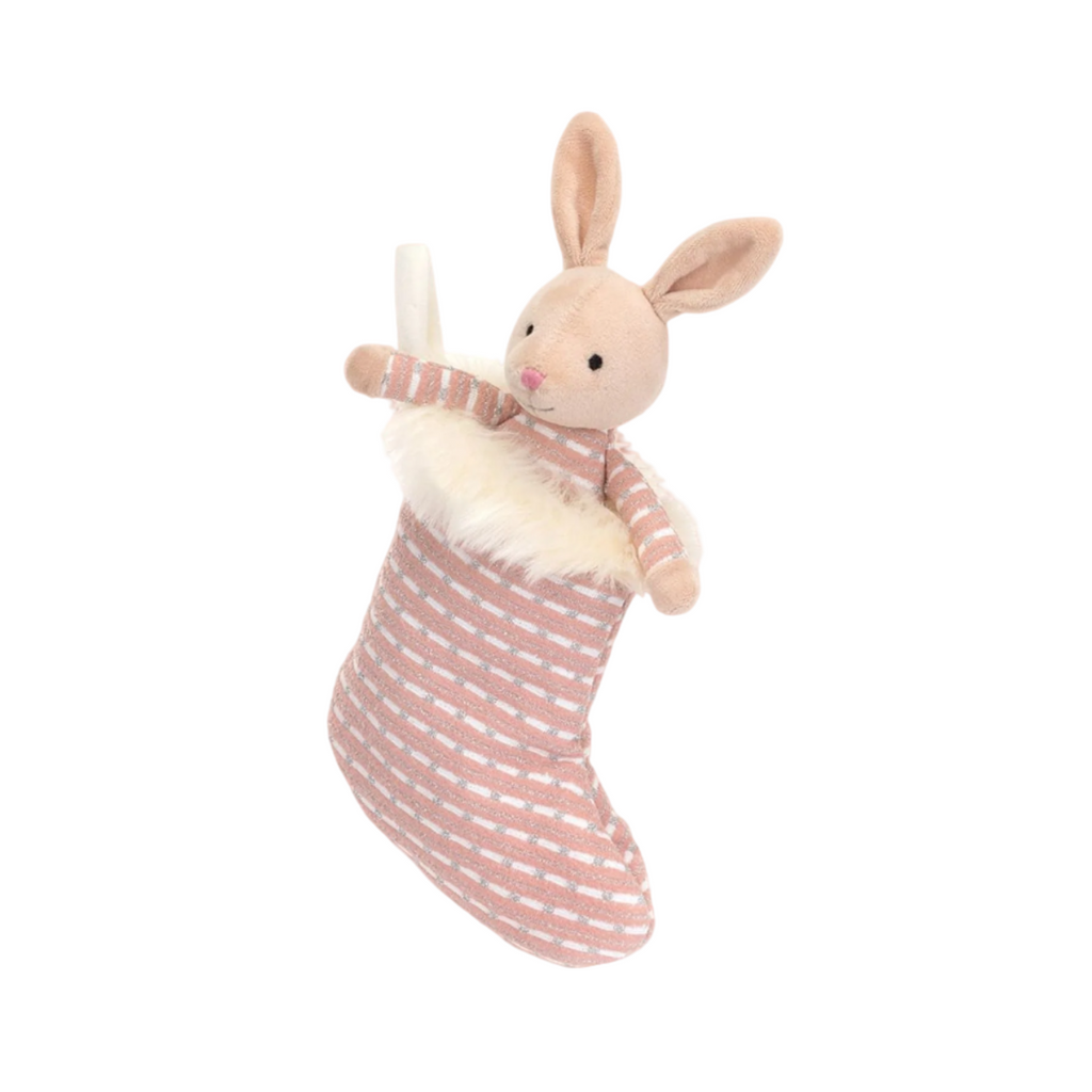 Shimmer Stocking Bunny is ready to sleep and dream of the joys of Christmas Day! This peachy bunny has sparkly pink jimjams that match their squishy fuzzy-trimmed stocking. Sometimes this scamp will wake up and hop out to check for presents, but don't tell Santa!