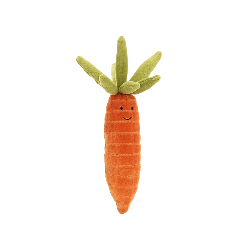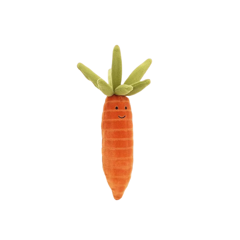 Cordy, colorful, cute and kooky, that's Vivacious Vegetable Carrot! Gorgeously textured and squeezably soft, this bright orange buddy has a punky green leaf-do! A veggie with plenty of energy, this smiley carrot knows the best produce parties.