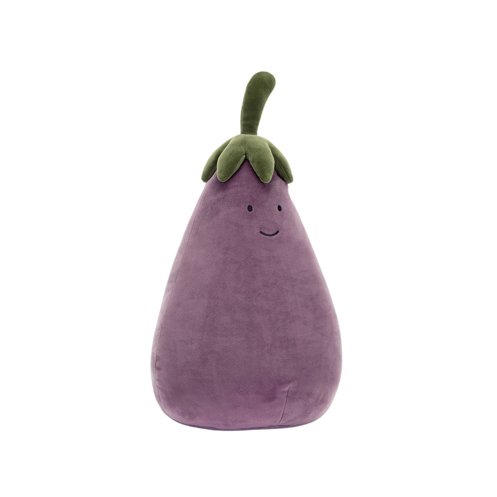 Vivacious Vegetable Eggplant just arrived in a very special veg box! Stretchy-soft in blush plum fur, with a sweet friendly smile and a green stalk hat, this one is scrumptiously squishable! Plump and perfect with a beany bottom, this aubergine is so serene!