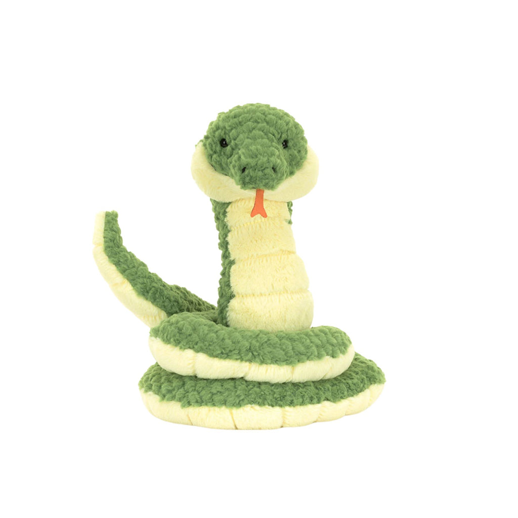 Cizi Snake is a statement-making serpent this festival season. Bright and bold in contrasting forest green and pale yellow fur, Cizi has soft textured scales, embroidered scutes detail, and a sweet, smiling face. Poised ready to strike for a cuddle, Cizi is showing off that suedette forked tongue.