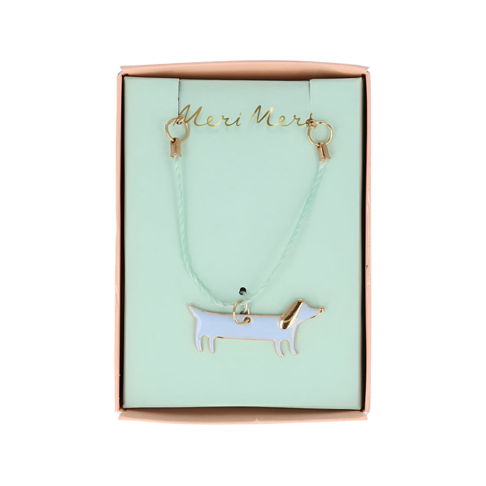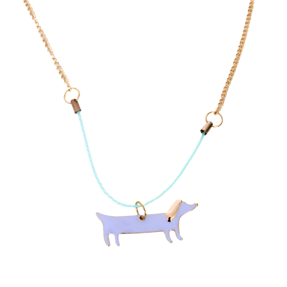 Sausage dogs are so on-trend, and make an adorable accessory. Wear this wonderful enamel, cord and gold tone necklace, whenever you want a charming look.