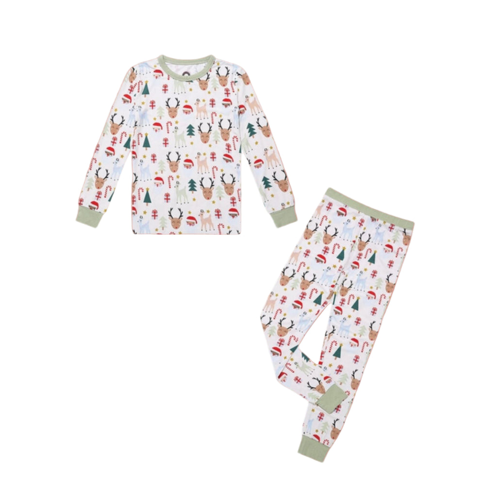 Soft viscose bamboo kids pajamas set in Emerson and Friends' Santa and Friends Holiday pattern! Check out more with this print for the cutest sibling match. Explore the most comfortable children's sleep wear ever.