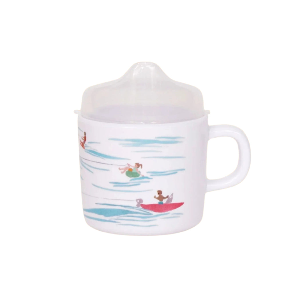 Watercolor texture can be seen in the waves and boaters on this gender neutral sippy cup. It has a removable clear top that can be set aside when it is time to transition to a toddler mug.